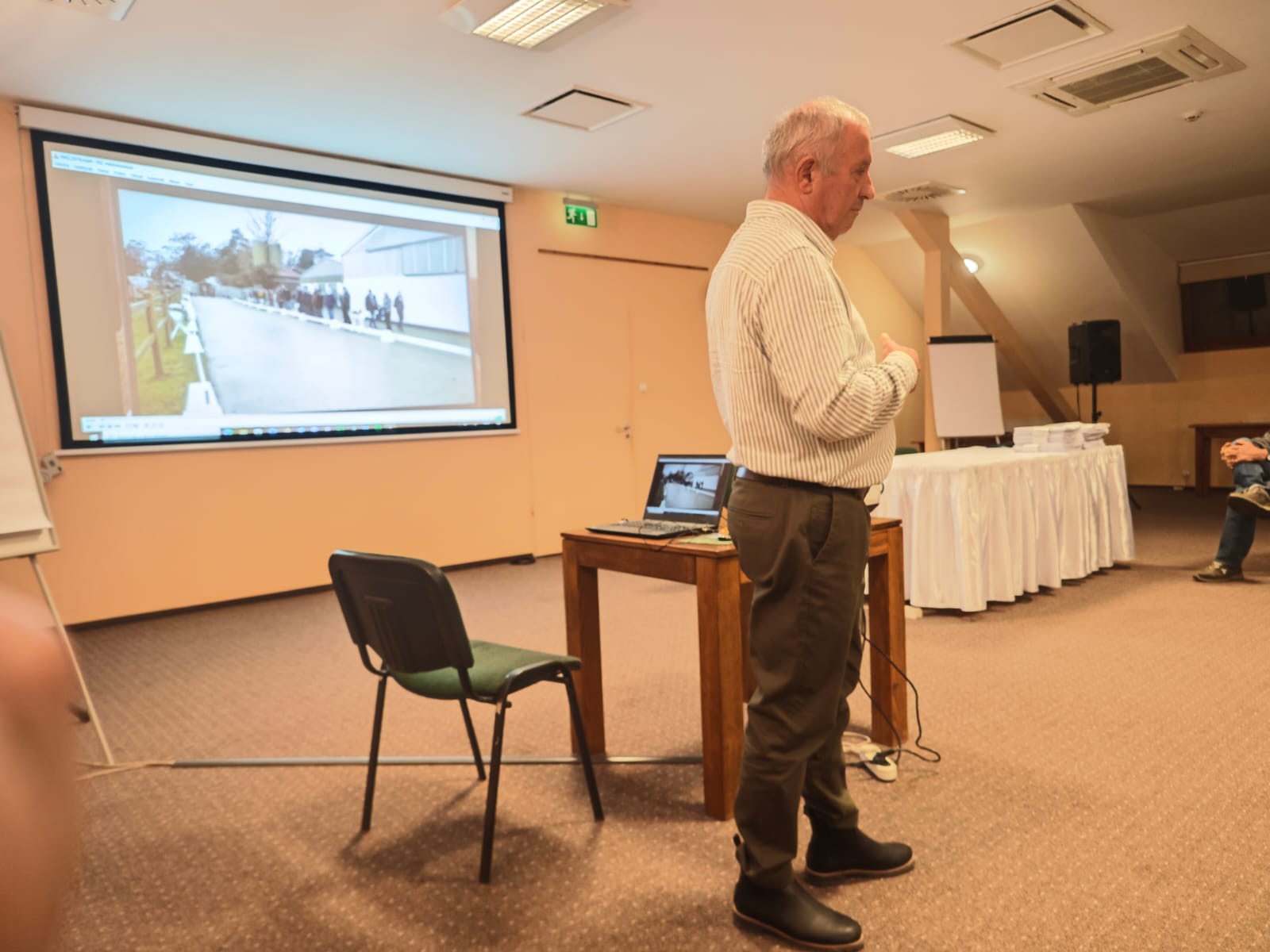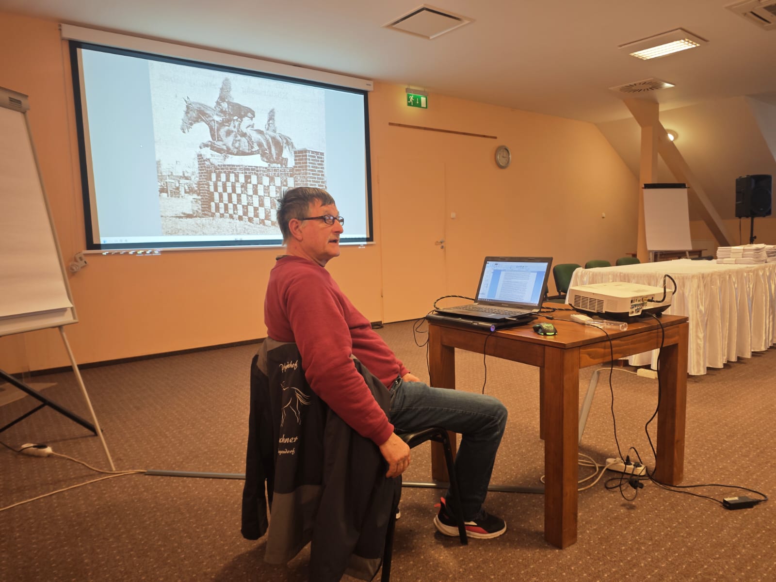 Amikor már eléggé kifagytunk, az előadóteremben folytattuk a programot Walleshausen Gyula előadásával. Gyula 10 évig dolgozott a sárvári ménesben, innen ered a kötődése a kisbéri-félvér fajtához. Sziszifuszi munkával válogatott össze legalább 40 képet az 1960-as, 70-es és 80-as évek díjugratásban nagypályákon versenyző, illetve díjlovaglásban kipróbált kisbéri-félvér lovairól. Sajnos a legtöbb ló már herélten került a díjugrató pályákra, a kancáknak pedig elenyésző hányada tudott a tenyésztésben maradandót alkotni, így a legjobb lovak nagy részének genetikája elveszett. Őzikének, aki Merengő Örzse nevű unokáján keresztül erős, különlegesen jó kancacsaládot alapított a TIMPEX Kft-nél, az olimpiai pályáját is láthattuk filmfelvételen.